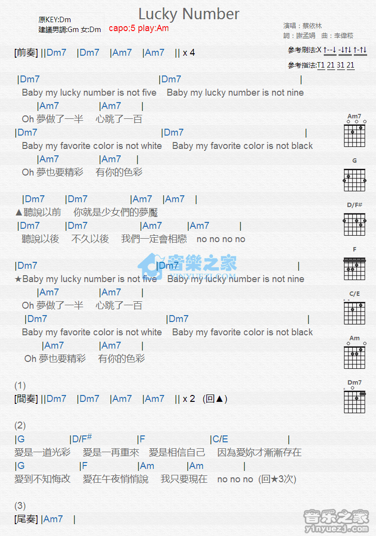 Am调版蔡依林《LuckyNunmber》吉他和弦弹唱谱...
