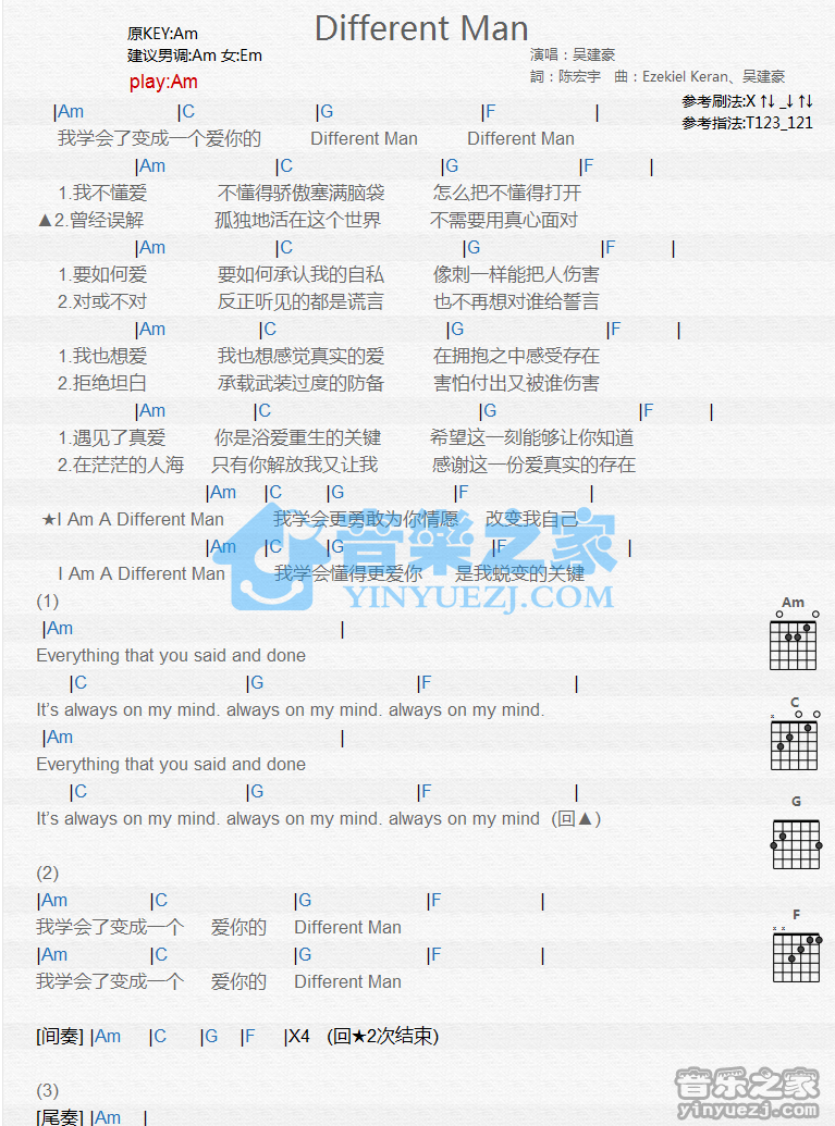 Am调版《DifferentMan》吉他和弦弹唱谱...