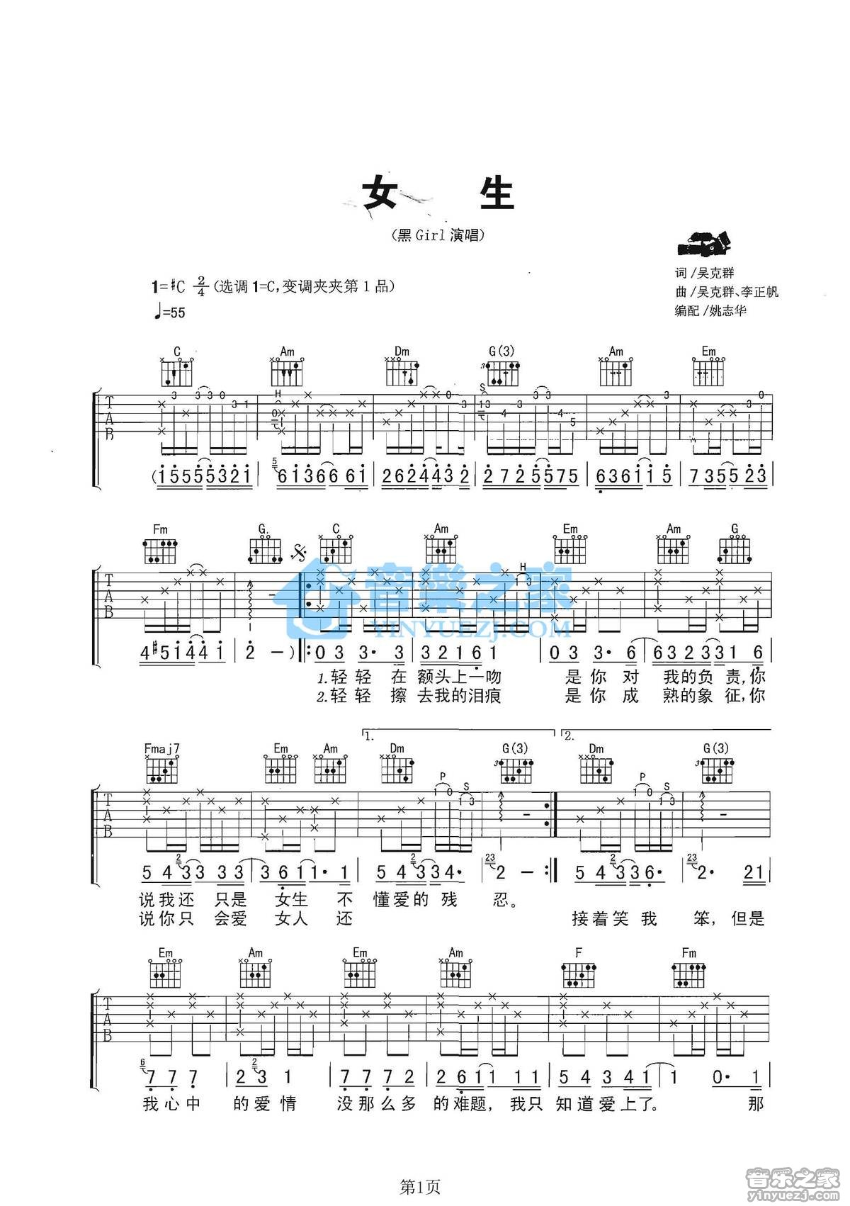 C调版黑Girl《女生》吉他弹唱六线谱...