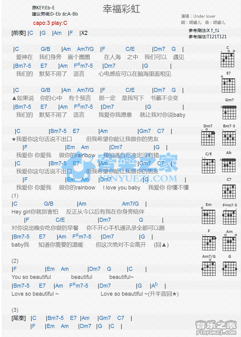 C调版UderLover《幸福彩虹》吉他和弦弹唱谱...