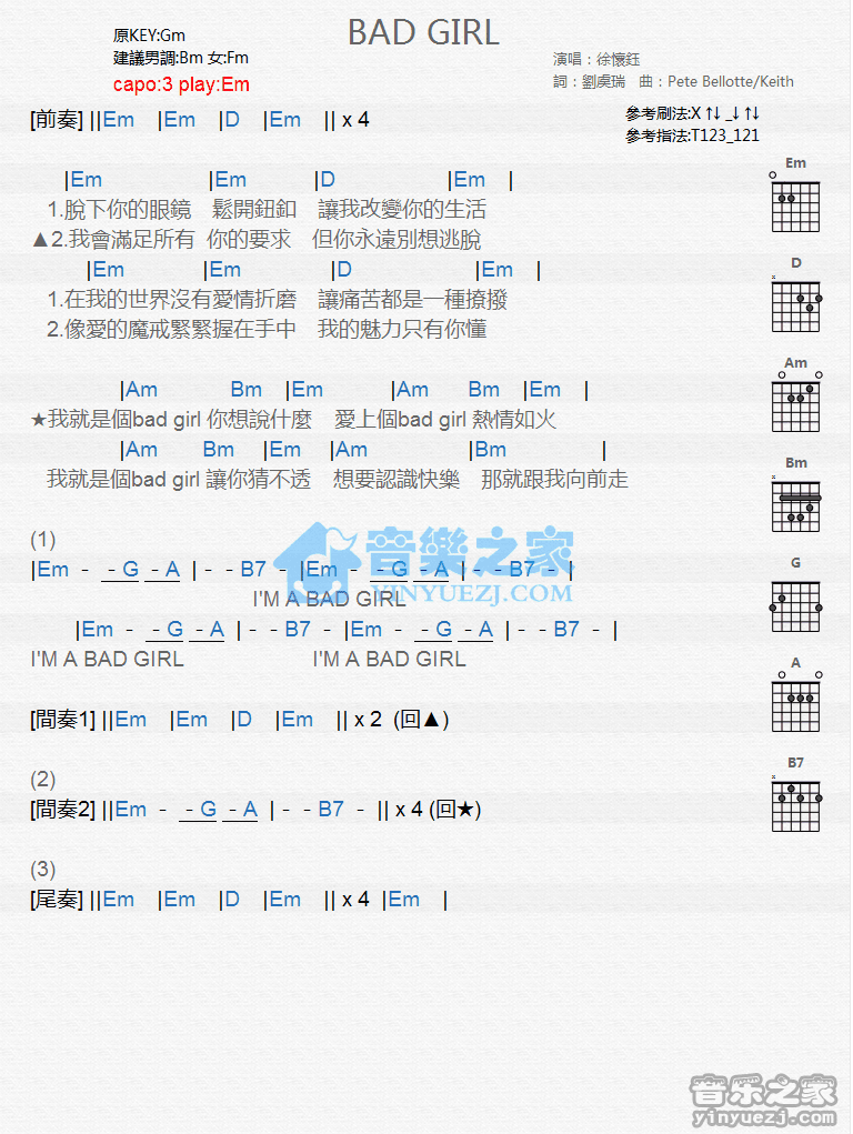 Em调版徐怀钰《BadGirl》吉他和弦弹唱谱...