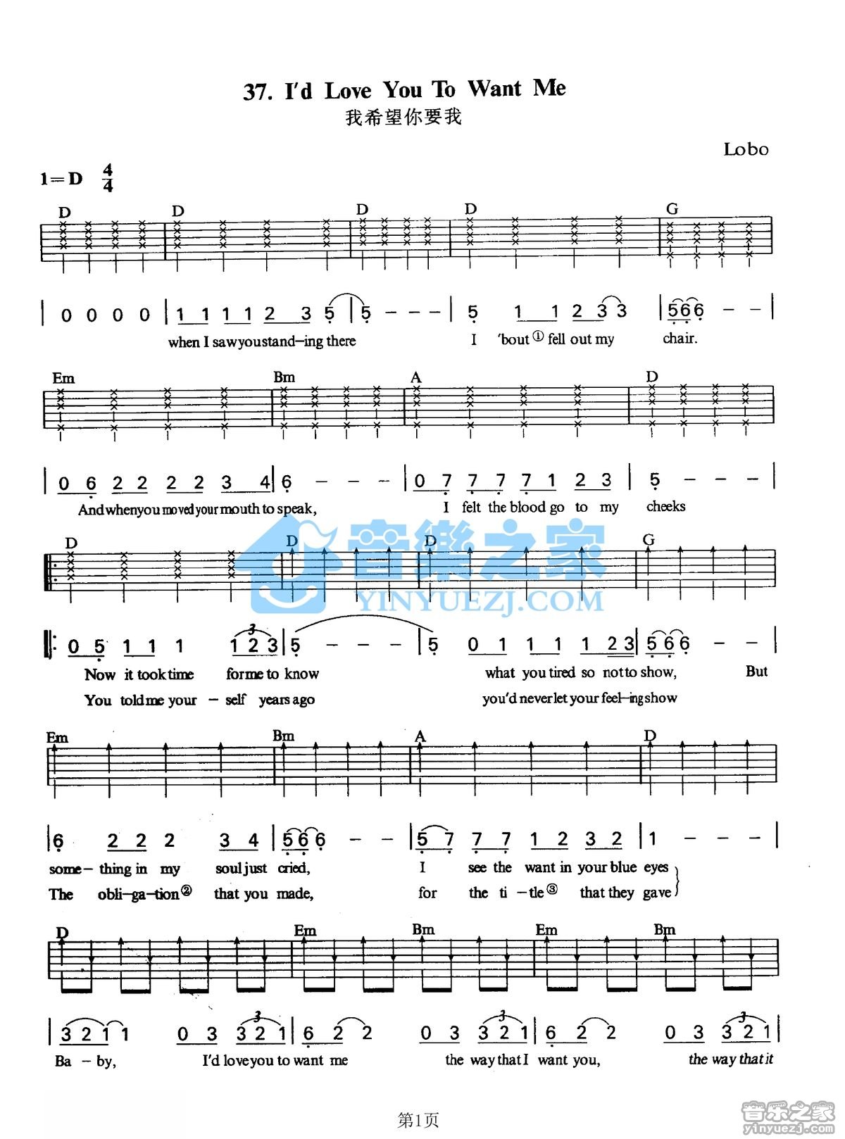 D调版Lobo《I'dLoveYouToWantMe》吉他弹唱六线谱...