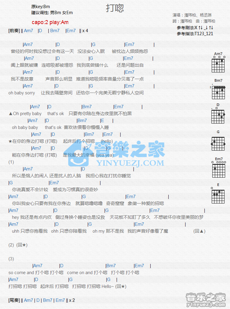 Am调版《打呼》吉他和弦弹唱谱...