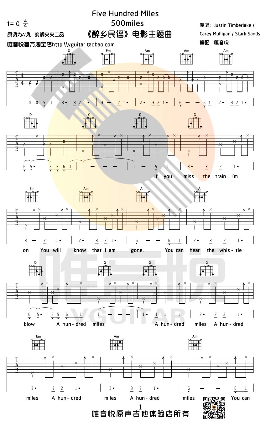 500Miles吉他谱,FiveHundredMiles吉他六线谱,电影《醉乡民谣》主题曲,一首经典英文歌曲,翻唱无数经久不衰百听不厌。原调A变调夹夹第二品。这首歌的和弦框架都是一样,琴友们背好后,再把节奏型抓好就可以脱谱了。歌曲节奏舒缓,旋律悠扬,让人在沉静里忘却人世间的万般烦...