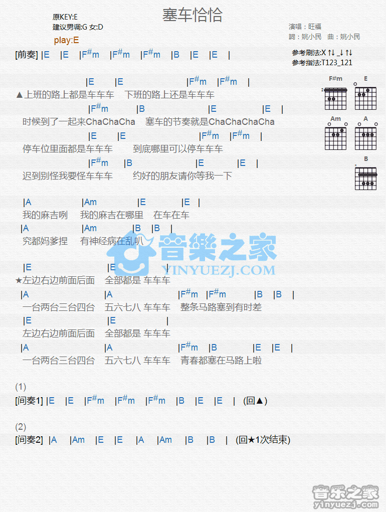 E调版旺福《塞车恰恰》吉他和弦弹唱谱...