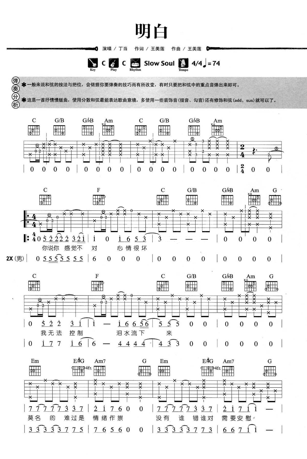 C调版丁当《明白》吉他弹唱六线谱...
