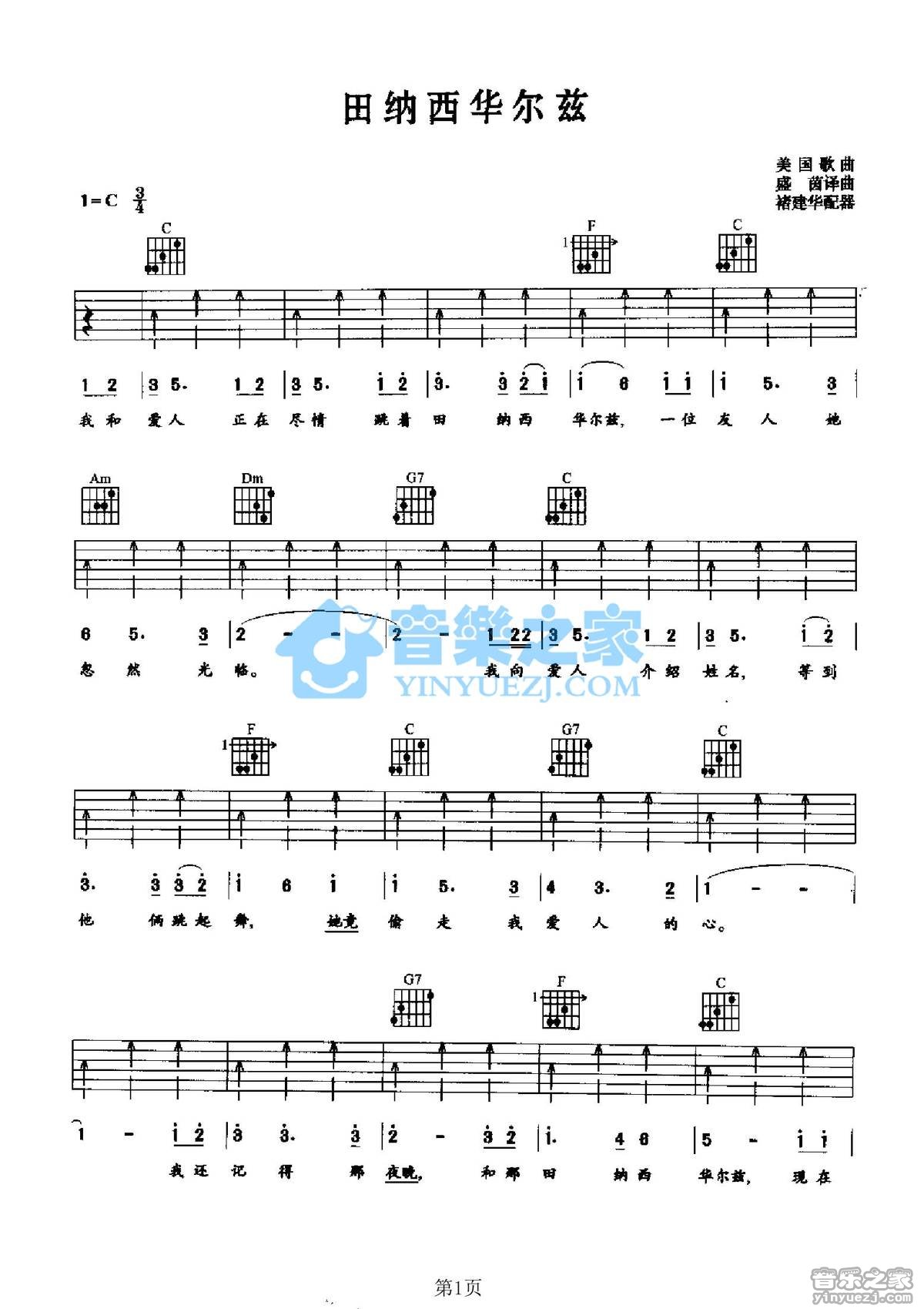 C调版美国歌曲《田纳西华尔兹》吉他弹唱六线谱...