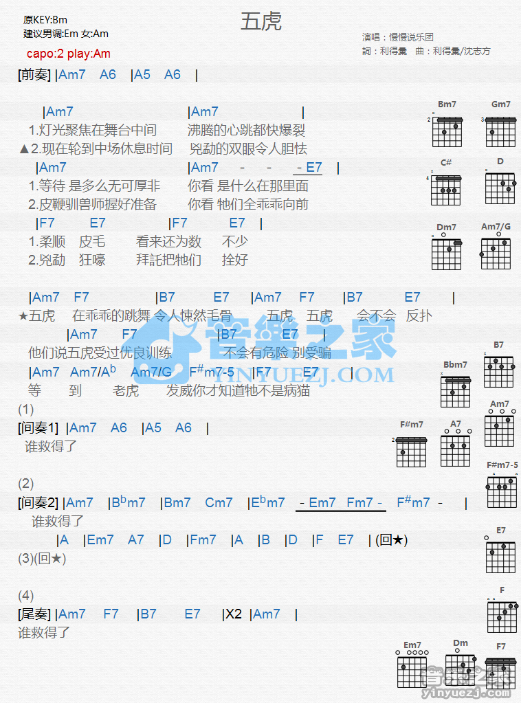 Am调版《五虎》吉他和弦弹唱谱...