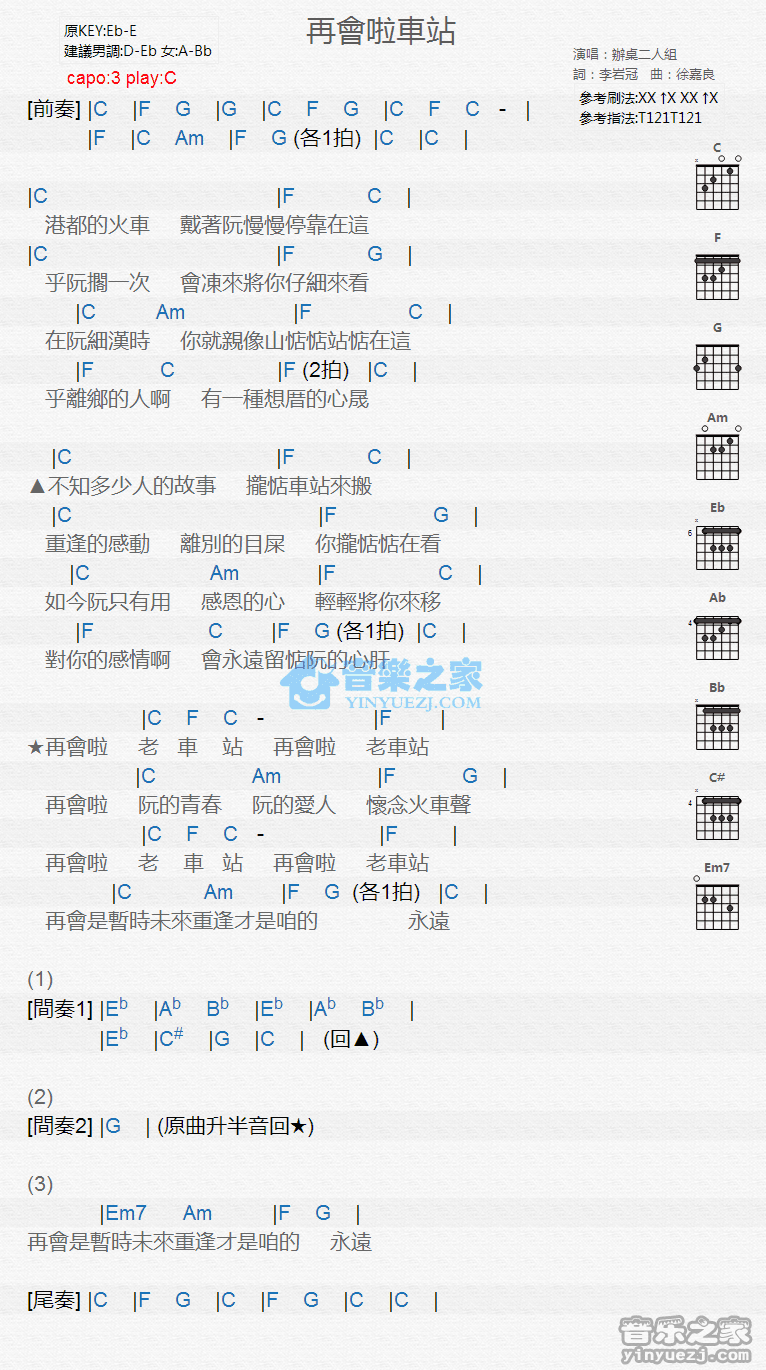 C调版《再会啦车站》吉他和弦弹唱谱...