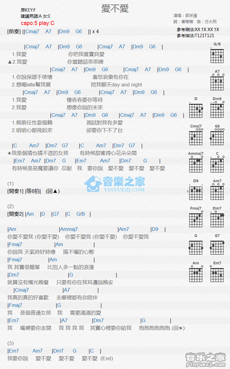 C调版郭采洁《爱不爱》吉他和弦弹唱谱...