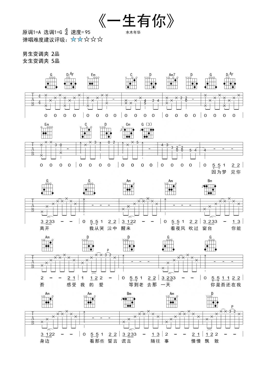 吉他水木年华《一生有你》吉他谱 - 很多人都在弹的版本