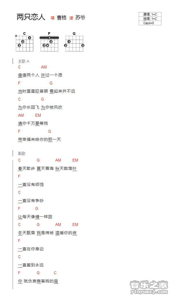 吉他曹格《两只恋人》吉他谱 - 非常多人都在弹的版本