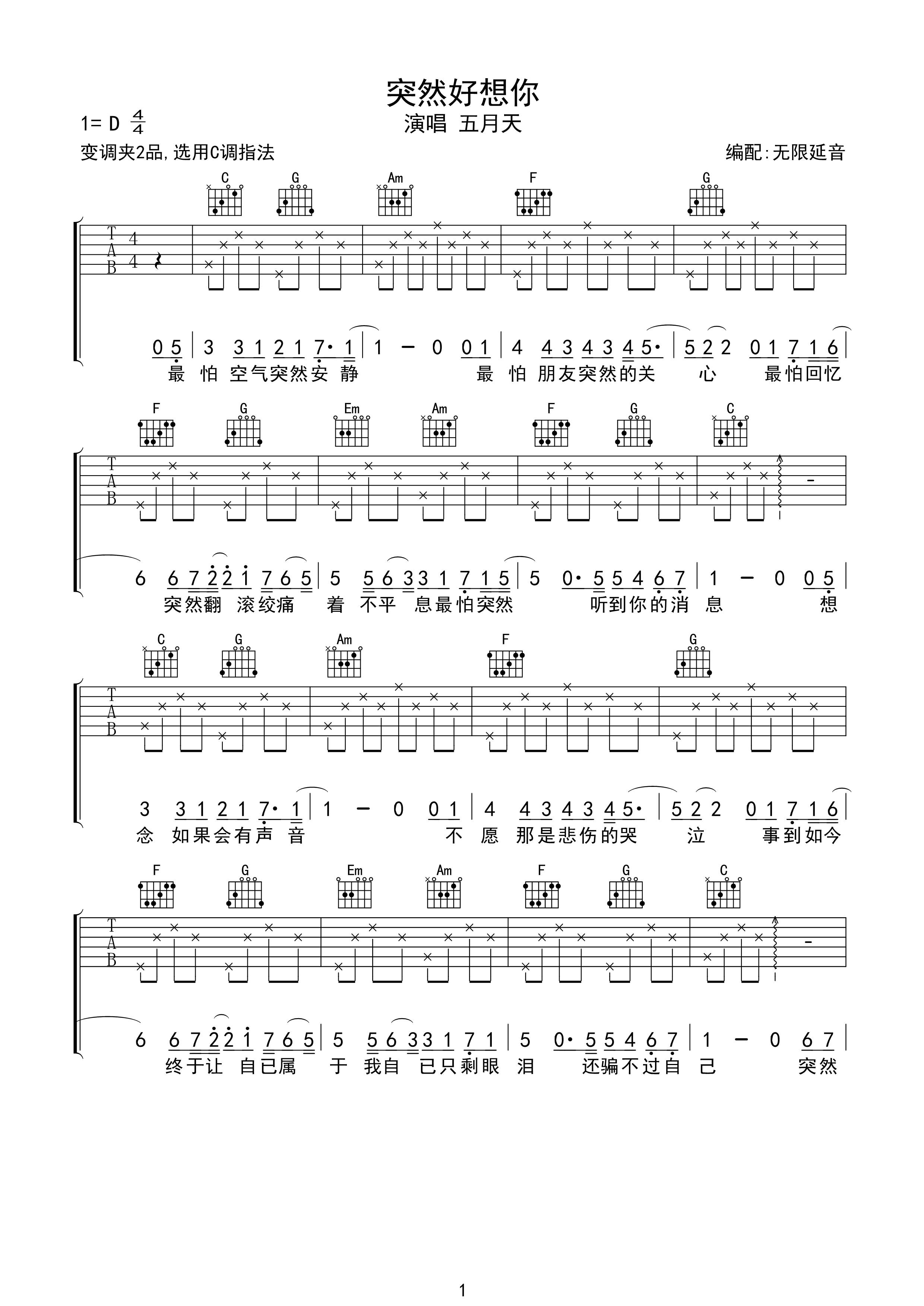 五月天《突然好想你》吉他谱,无限延音编配出品,共有3张高清图谱。...