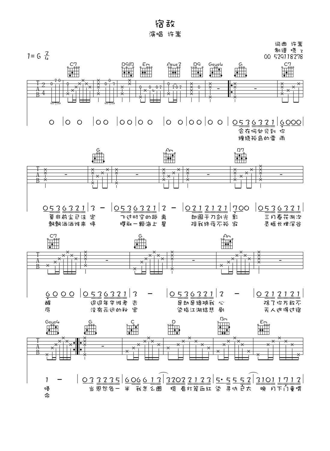 许嵩《宿敌》吉他谱,共有2张高清图谱,免翻页排版设计。...