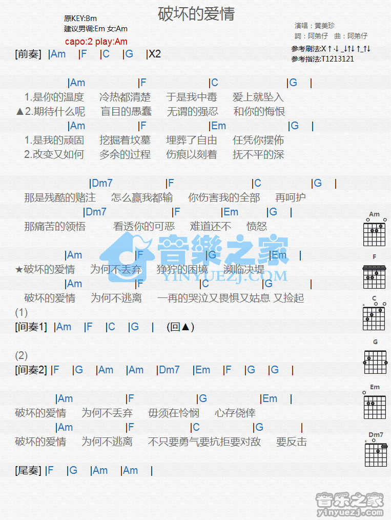 Am调版黄美珍《破坏的爱情》吉他和弦弹唱谱...