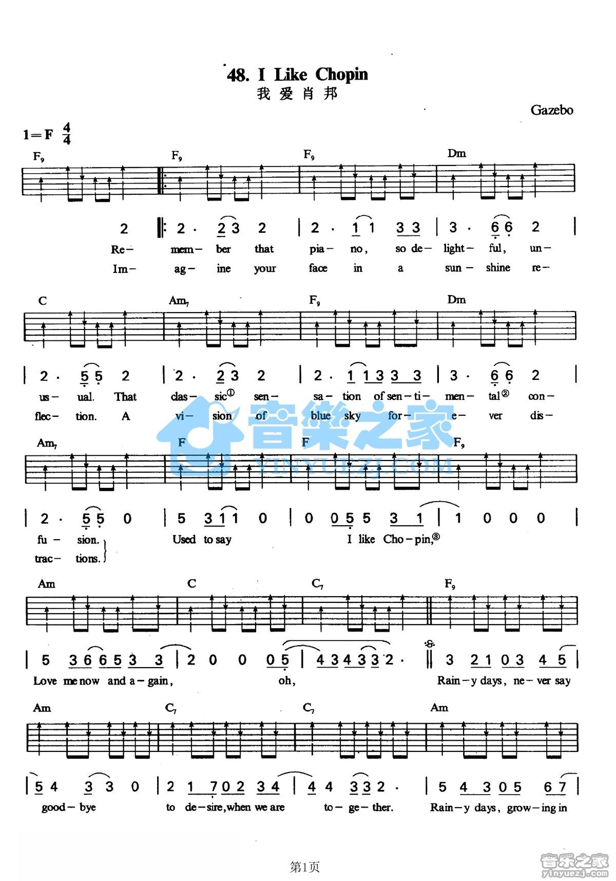 F调版Gazebo《ILikeChopin》吉他弹唱六线谱...