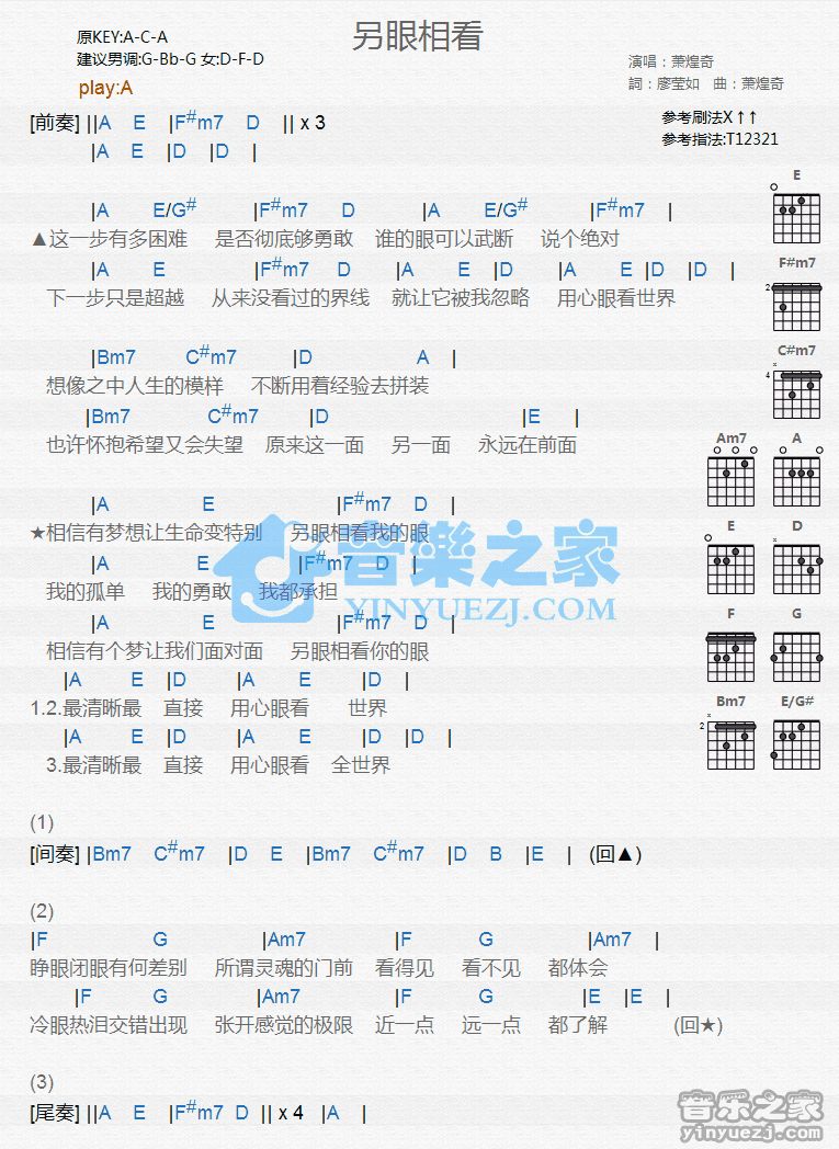 A调版萧煌奇《另眼相看》吉他和弦弹唱谱...