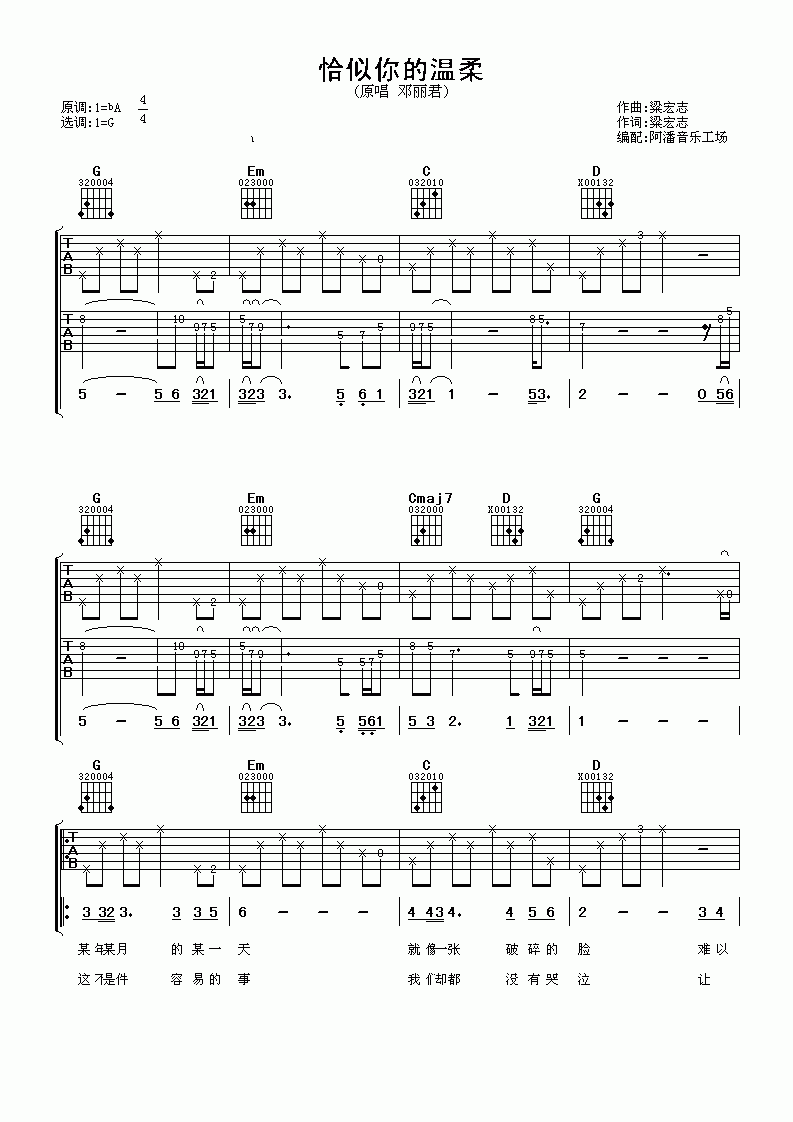 邓丽君《恰似你的温柔》吉他谱_G调吉他弹唱谱...