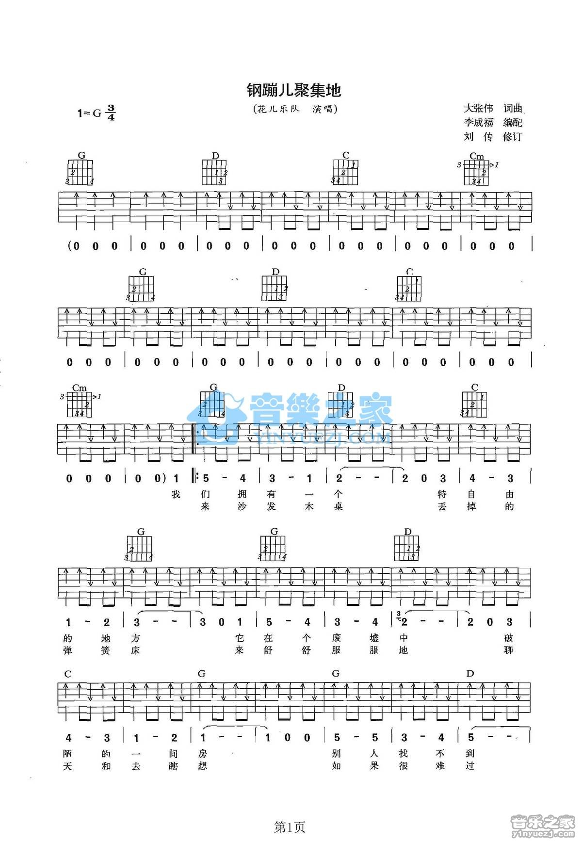 G调版花儿乐队《钢蹦儿聚集地》吉他弹唱六线谱...