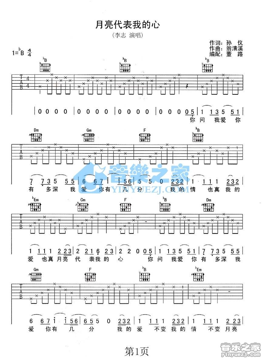 李志《月亮代表我的心》吉他谱_B调吉他弹唱谱...