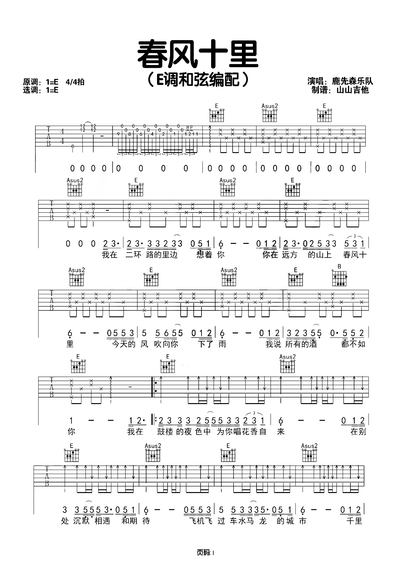 鹿先生乐队《春风十里》吉他谱_E调吉他弹唱谱...