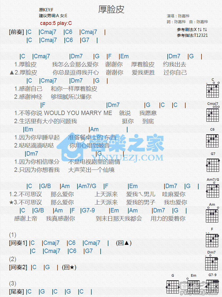 C调版陈嘉桦《厚脸皮》吉他和弦弹唱谱...