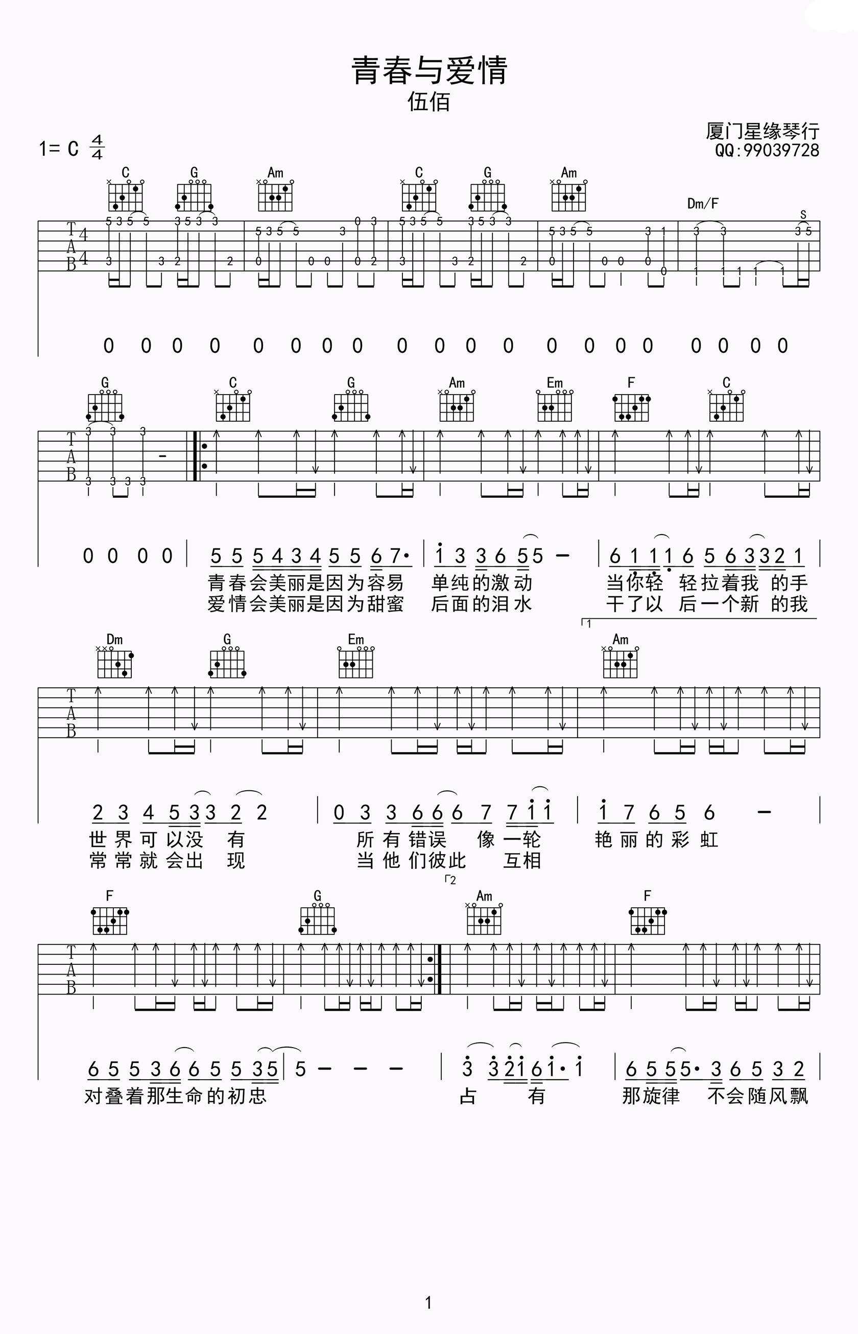 吉他伍佰《青春与爱情》吉他谱 - 好听到爆炸