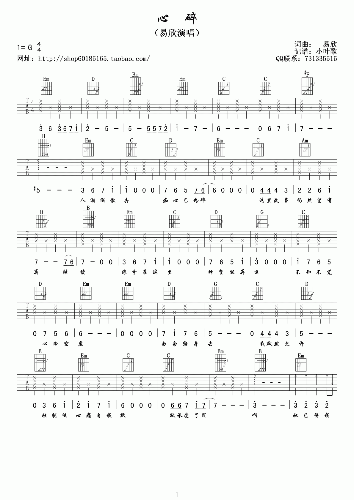 易欣《心碎》吉他谱,小叶歌编配出品,共有2张高清图谱,免翻页排版设计。...