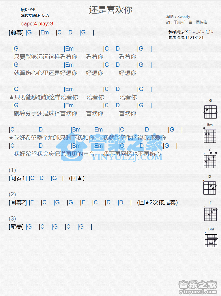 G调版Sweety《还是喜欢你》吉他和弦弹唱谱...