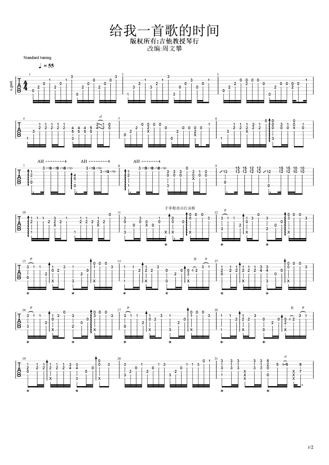 给我一首歌的时间指弹吉他谱,改编自周杰伦的一首经典情歌,能不能给我一首歌的时间,把故事听到最后才说再见。《给我一首歌的时间》吉他独奏谱,标准音调弦,六线谱共两张图片,感谢周文攀编配分享,曲谱宝上传更新。 耳熟能详的旋律,总能让人忍不住跟着哼唱几句,宛如回忆中逝去的青春的...