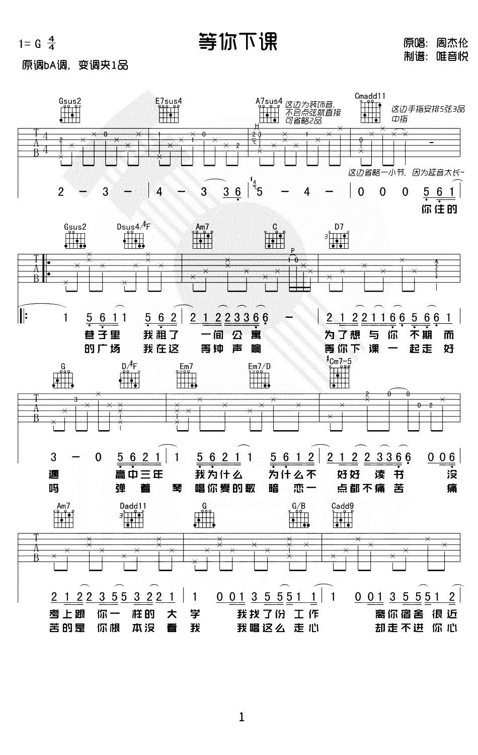 吉他周杰伦《等你下课》吉他谱-推荐版本