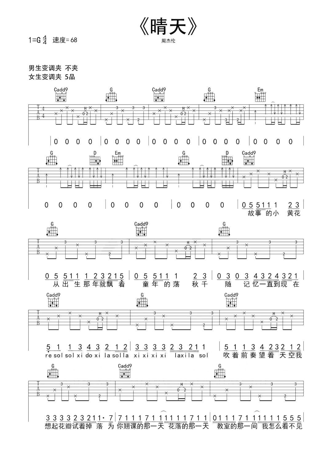 吉他周杰伦《晴天》吉他谱 - 免费版