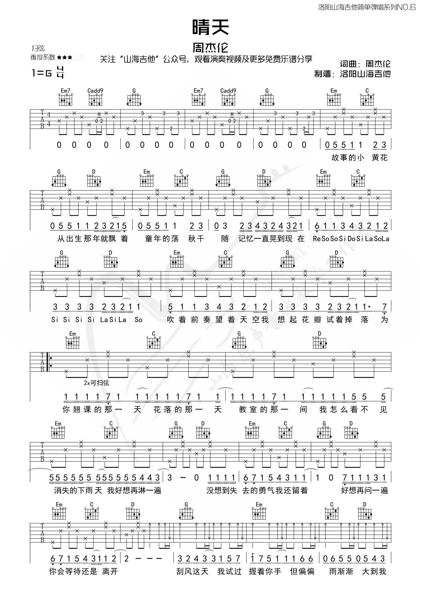 周杰伦《晴天》吉他谱,山海吉他编配出品,共有2张高清图谱,免翻页排版设计。...