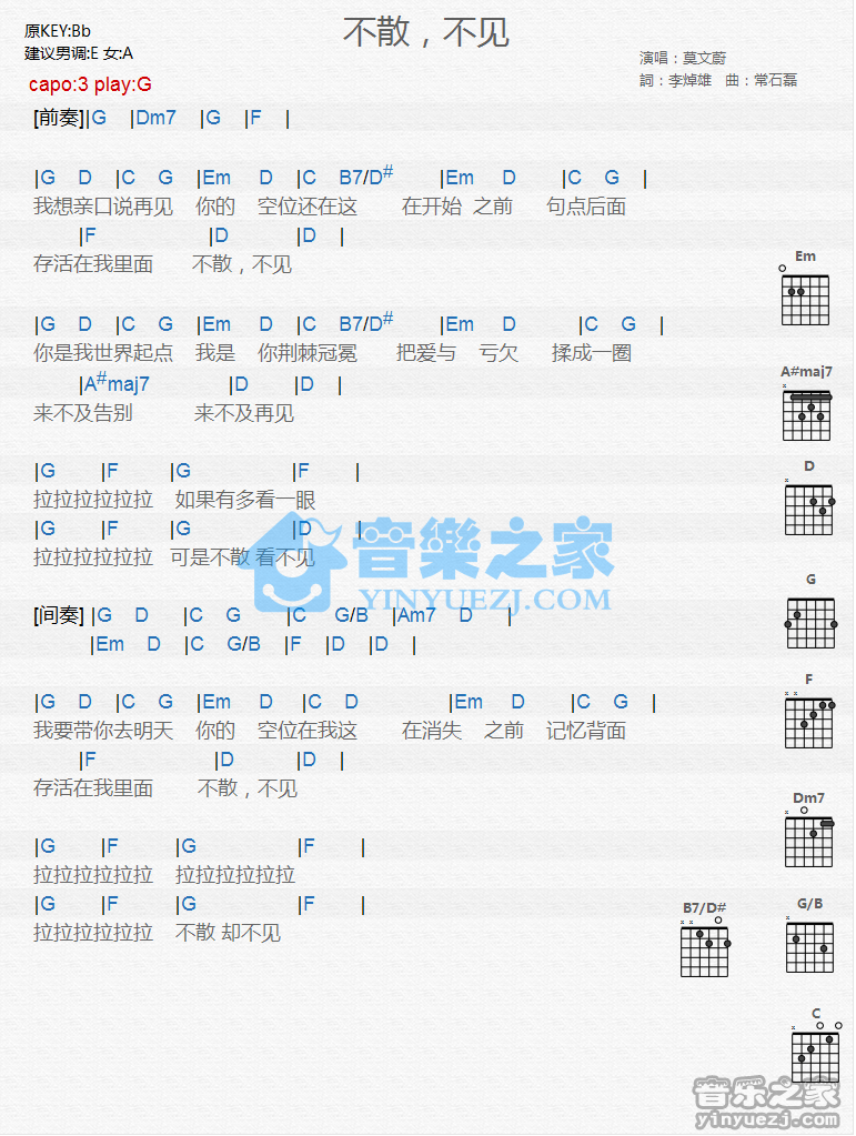 G调版莫文蔚《不散不见》吉他和弦弹唱谱...