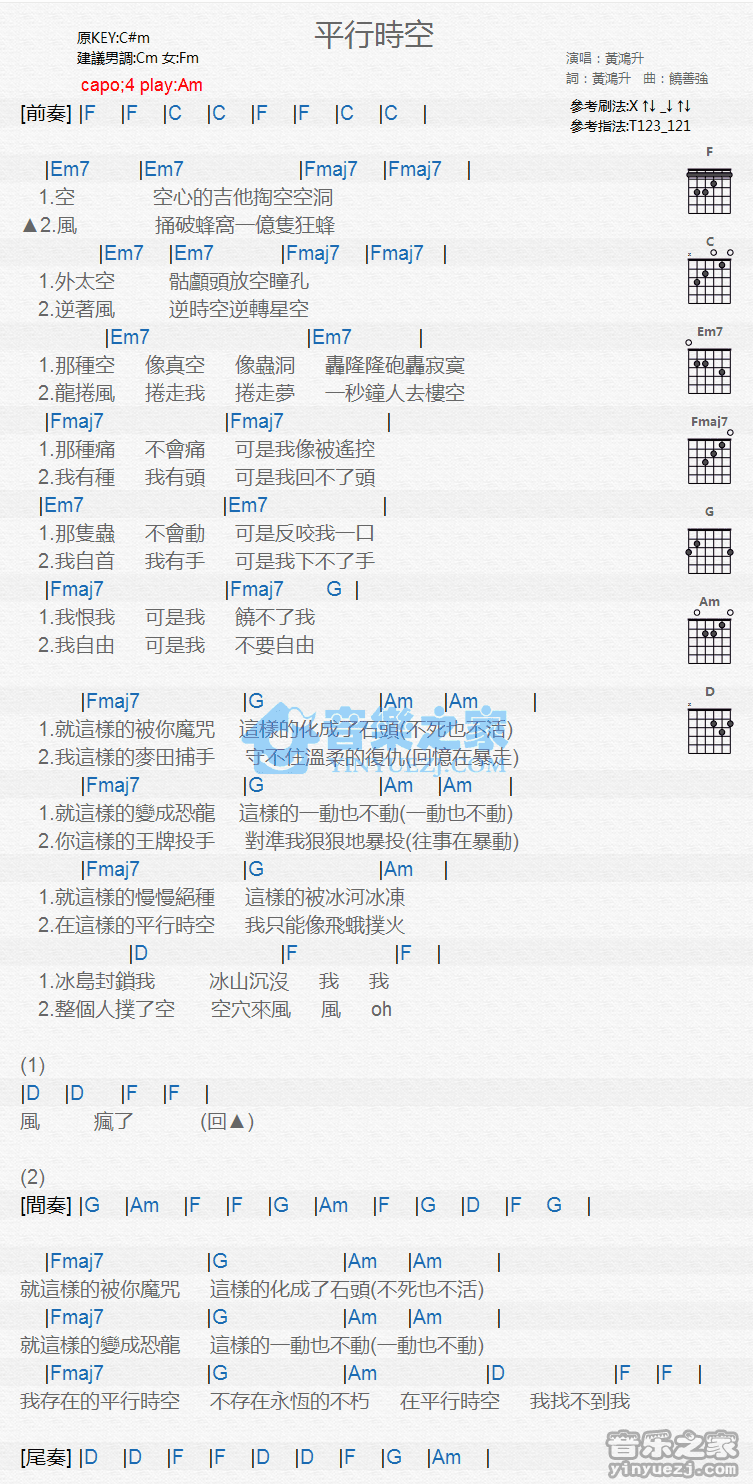 Am调版黄鸿升《平行时空》吉他和弦弹唱谱...