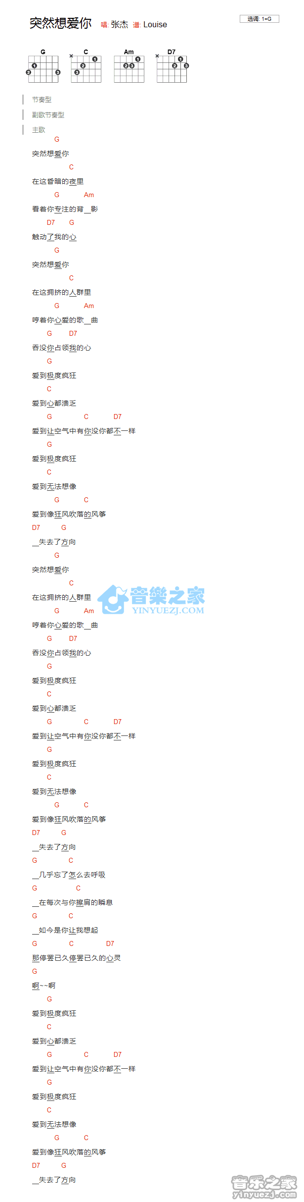 G调版张杰《突然想爱你》吉他和弦弹唱谱...