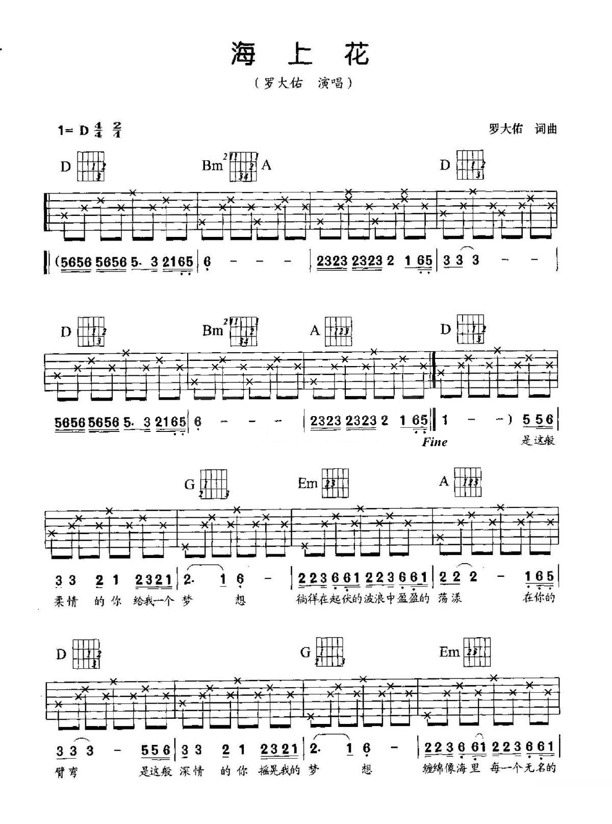 D调版罗大佑《海上花》吉他弹唱六线谱...
