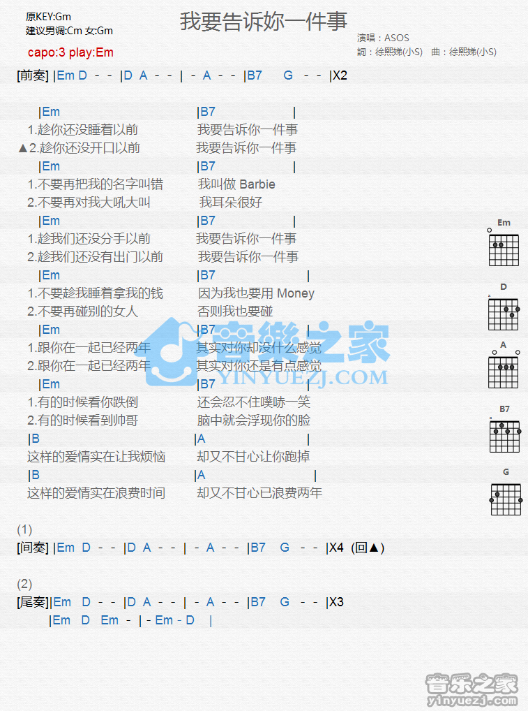 Em调版《我要告诉你一件事》吉他和弦弹唱谱...