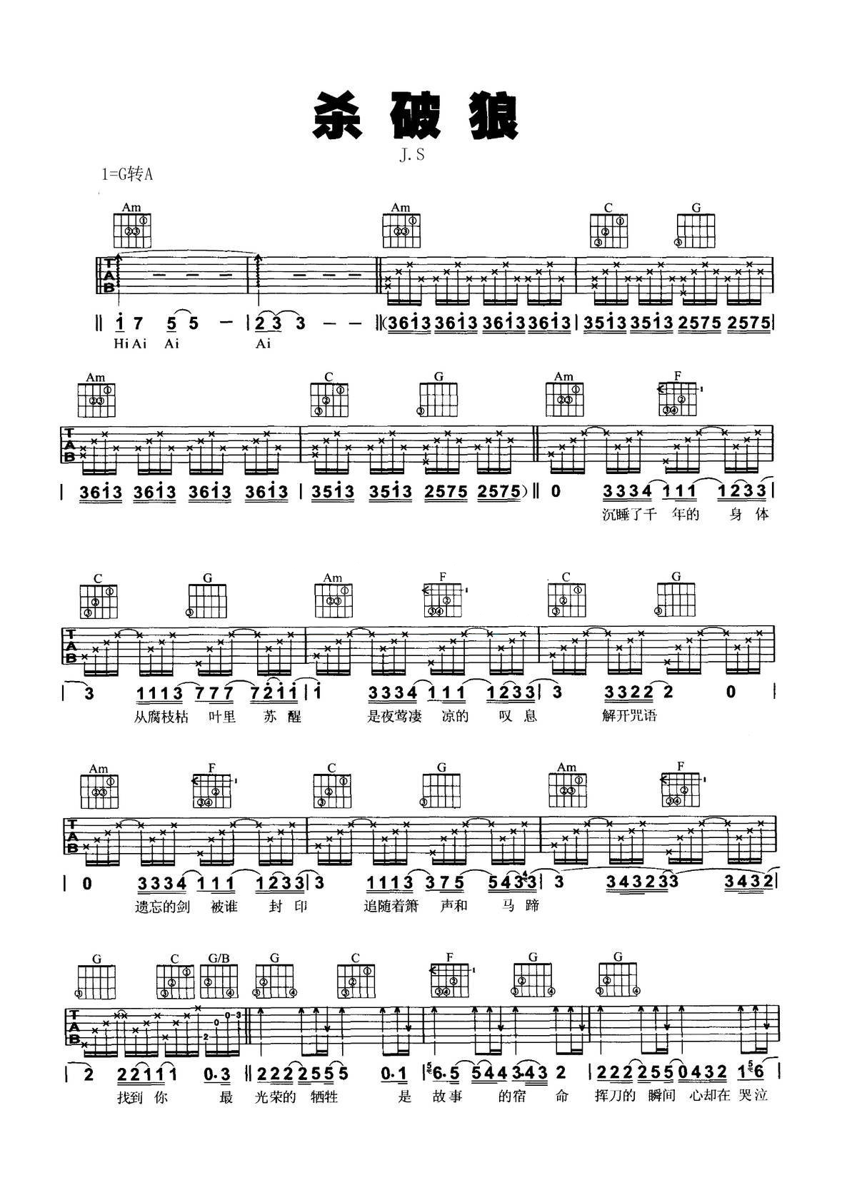 G转A调版JS《杀破狼》吉他弹唱六线谱...