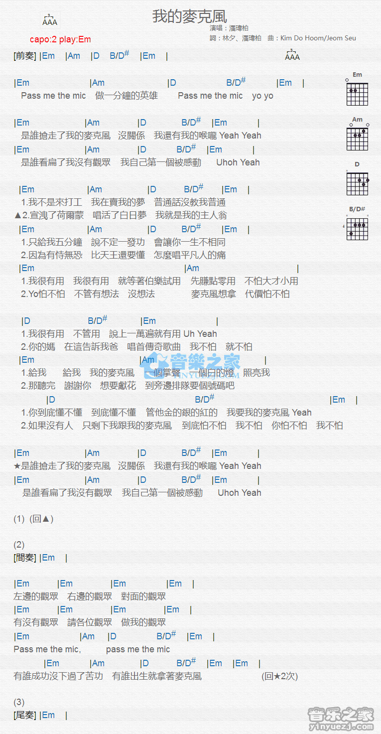 Em调版潘玮柏《我的麦克风》吉他和弦弹唱谱...