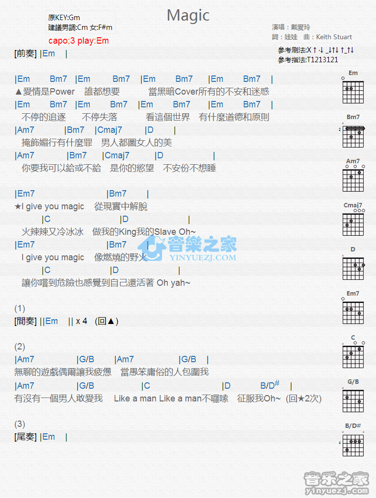 Em调版戴爱玲《Magic》吉他和弦弹唱谱...