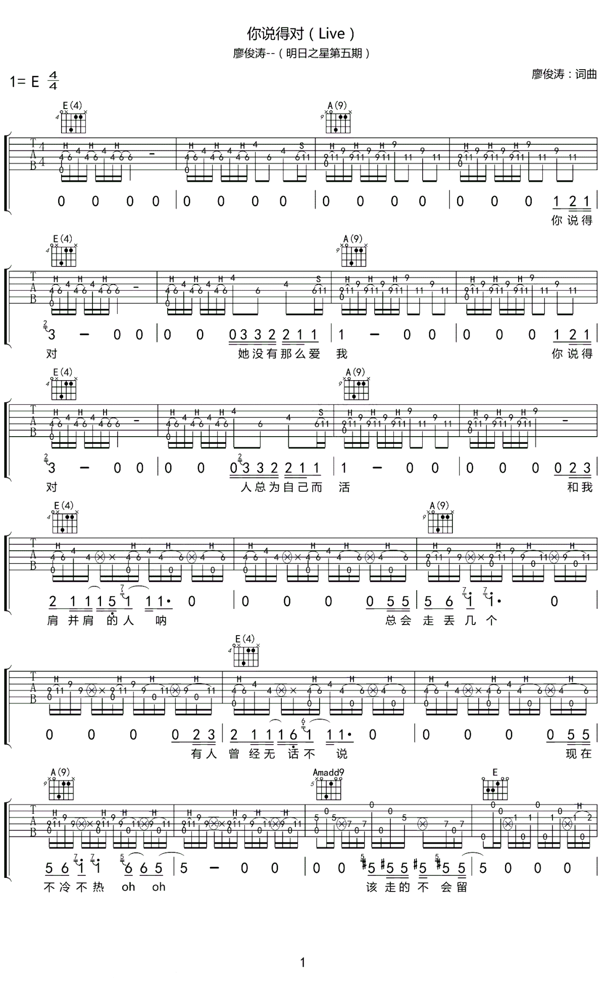 吉他 廖俊涛 《你说得对》吉他谱