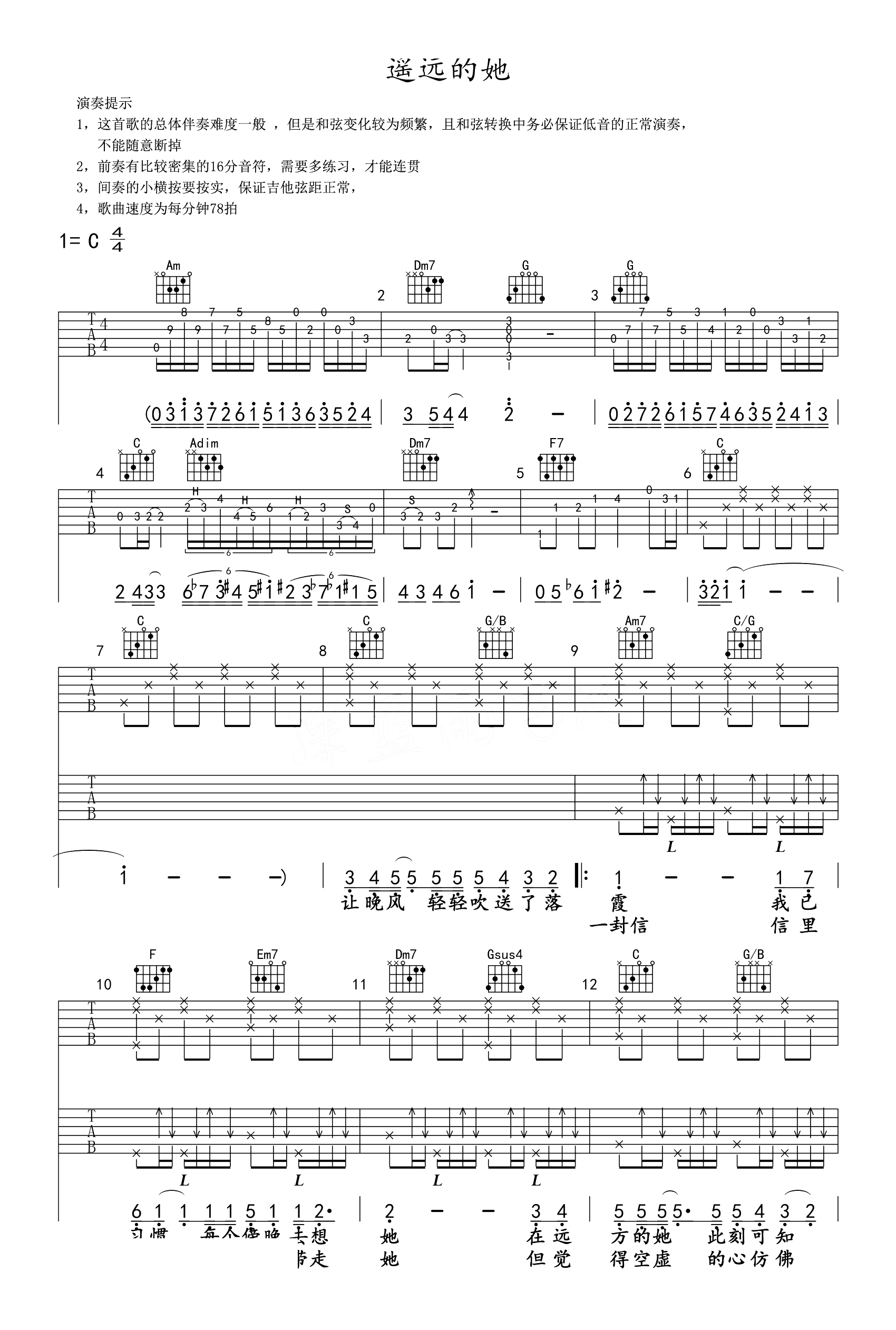张学友遥远的她吉他谱,C调弹唱谱,演奏提示:这首歌曲的总体伴奏难度一般,但是和弦变化较为频繁,且和弦转换中务必保证低音的正常演奏,不能随意断掉。前奏多加练习才能熟练连贯;间奏的小横按需要按实,保证吉他弦距正常;...