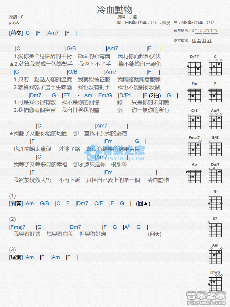 C调版丁当《冷血动物》吉他和弦弹唱谱...