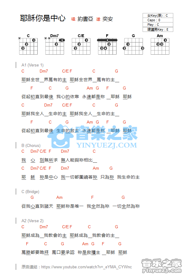C调版约书亚《耶稣你是中心》吉他和弦弹唱谱...