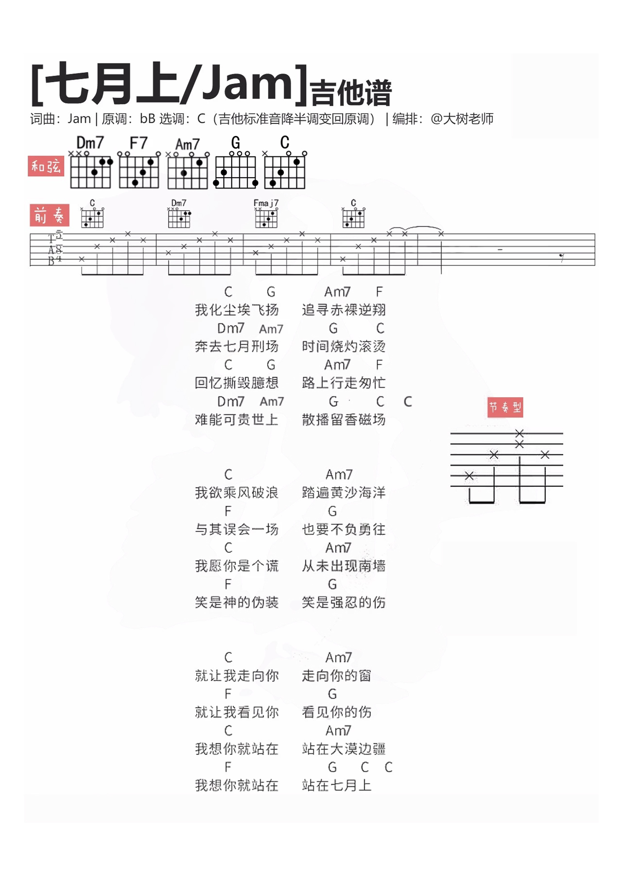 吉他陈粒《七月上》吉他谱 - 大树乐器编配