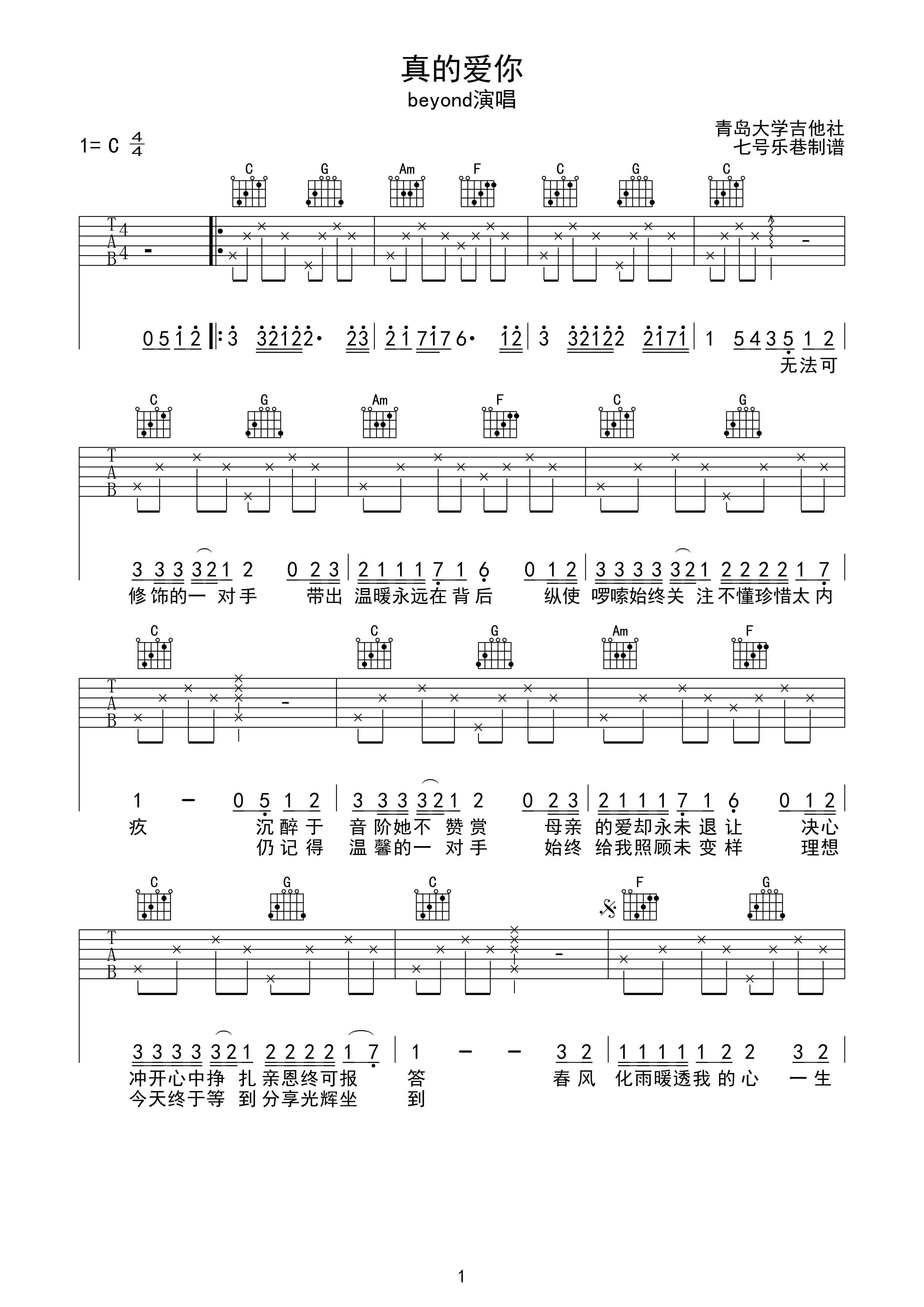 beyond《真的爱你》吉他谱_C调吉他弹唱谱...