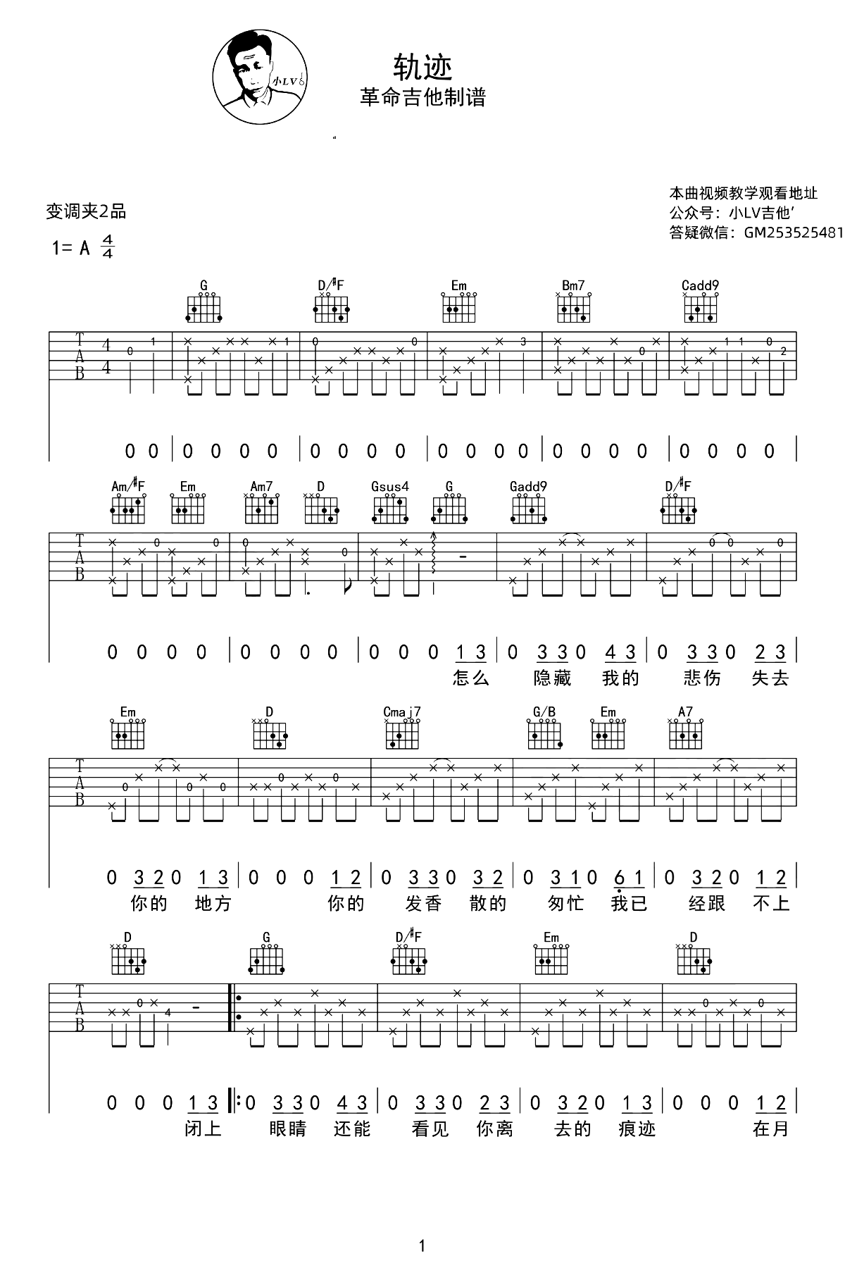 轨迹吉他谱,周杰伦一首比较早期的作品了,也是传唱度比较高的一首经典之作。《轨迹》吉他弹唱谱,原调为A调,选用G调和弦指法,变调夹夹2品,一共三张图片六线谱,感谢革命吉他编配分享,曲谱宝更新上传。 一首抒情歌曲,虽然演唱难度不高,旋律简单,但它却能直击我们最柔软的回忆。恰...
