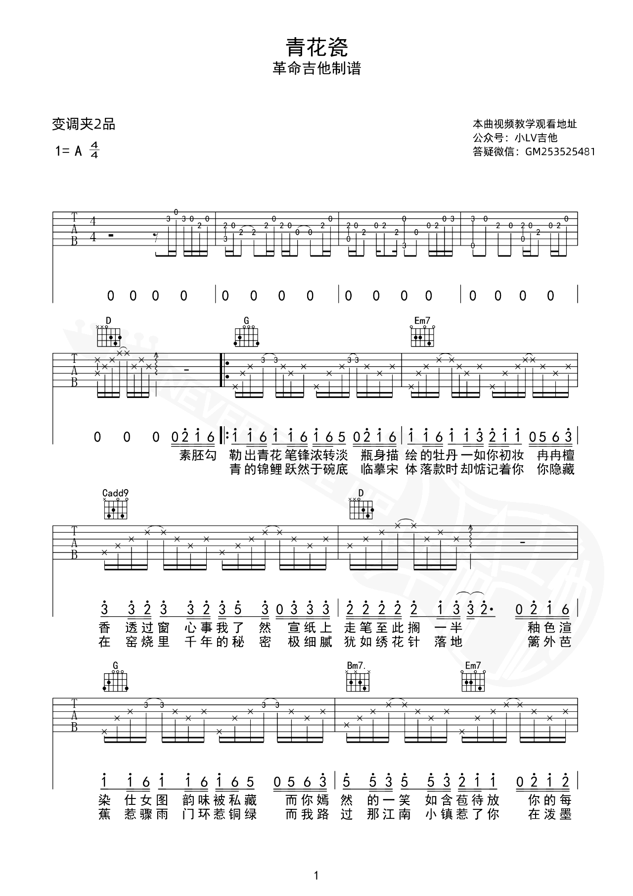 青花瓷吉他谱,周杰伦的一首经典中国风歌曲,如同一件青瓷极品,自顾自美丽,清新典雅,古朴流畅。《青花瓷》吉他弹唱谱,原调A,采用了G调好像指法。六线谱完整版共两张图片,感谢革命吉他制谱分享,曲谱宝更新上传。 周杰伦的唱腔柔情古韵,仿佛江南戏曲的雏形,情感真挚。填词与复古音乐相得益彰...