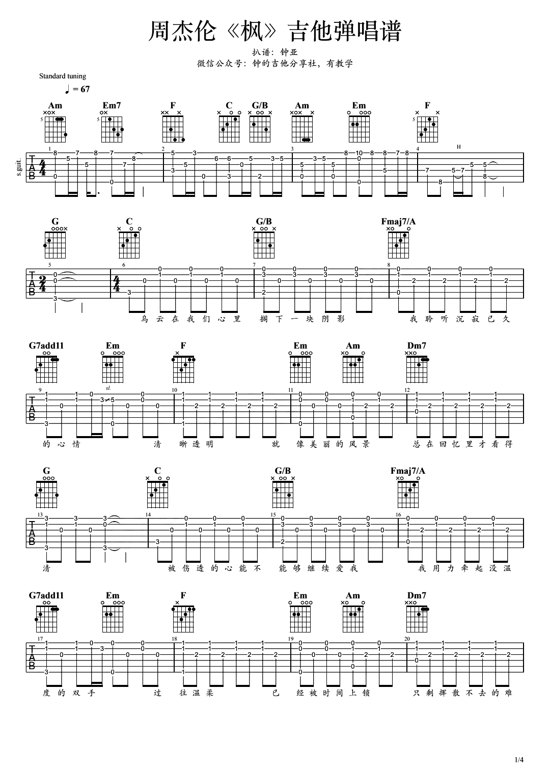 枫吉他谱,周杰伦演唱的一首伤感情歌,精编前奏+间奏完整版。《枫》吉他弹唱谱,六线谱完整版共四张图片六线谱,感谢钟亚编配出品分享,曲谱宝更新。 精心编配的前奏和间奏,主歌伴奏用的分解节奏型,副歌伴奏用的扫弦节奏型。后面的歌曲从C调转到#C调,和弦全部改为大横按了,坚持下来...